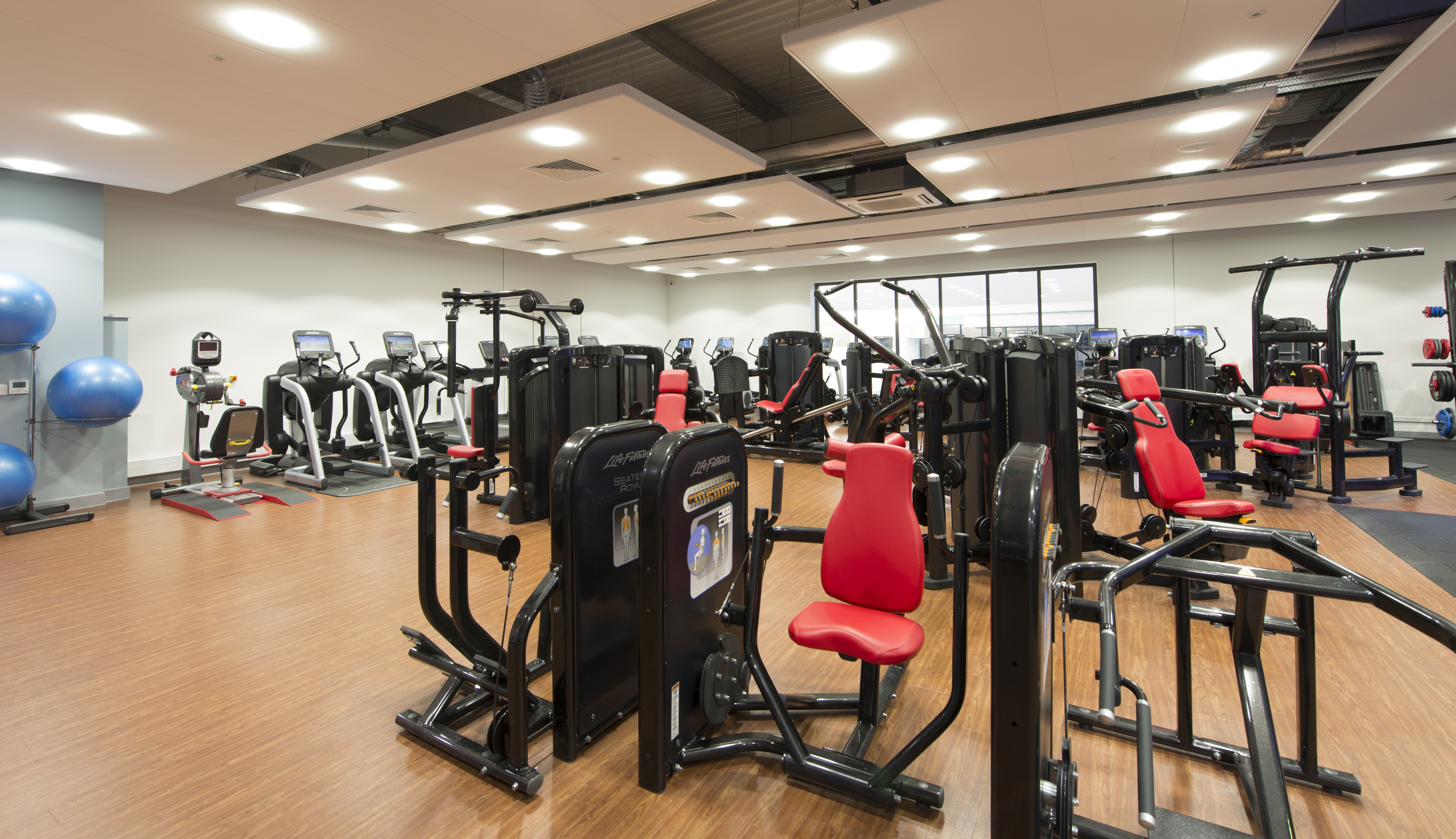 Products: Focus™ Ds with Edge 500 (rafts in gym and studios), Akusto™ Edge C Akutex FT (Main circulation space), Akusto™ Edge A Super G (sports hall), Hygiene Performance™ C4 (dry changing and shower areas)