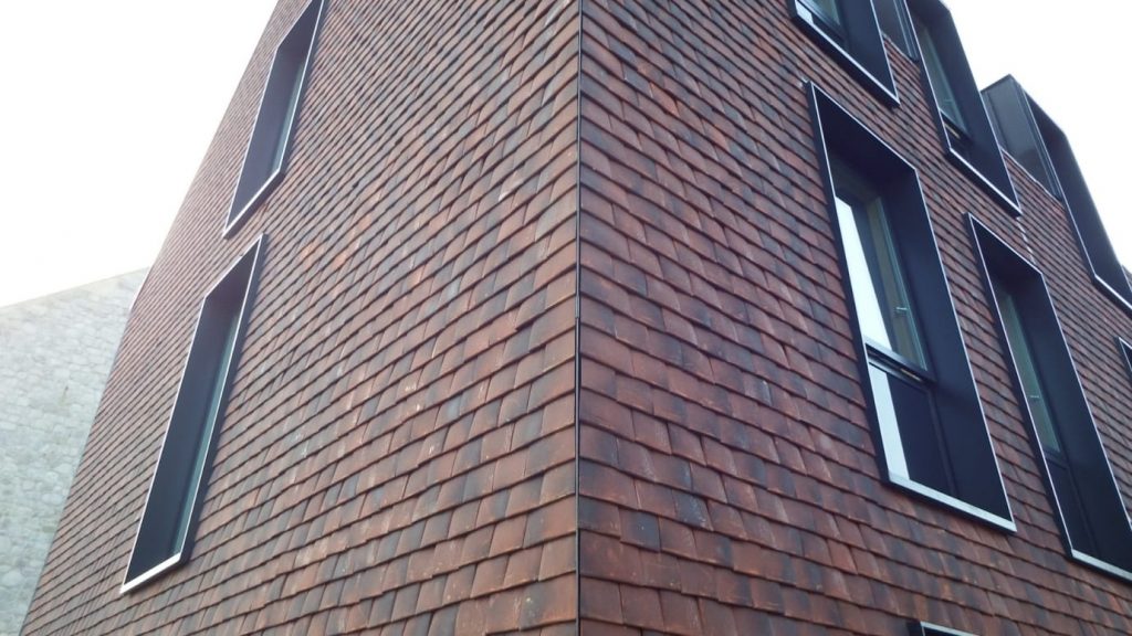 The design remit for the building was to create a neat, angular and seamless quality, therefore external angle tiles were not used and all corner tiles were cut to create an elegant edge against the aluminium corner trim. Additionally, all tiles under the windows were cut by hand to assist in waterproofing the building as no lead was used. Precision cutting on the angle ensured a perfect fit.
