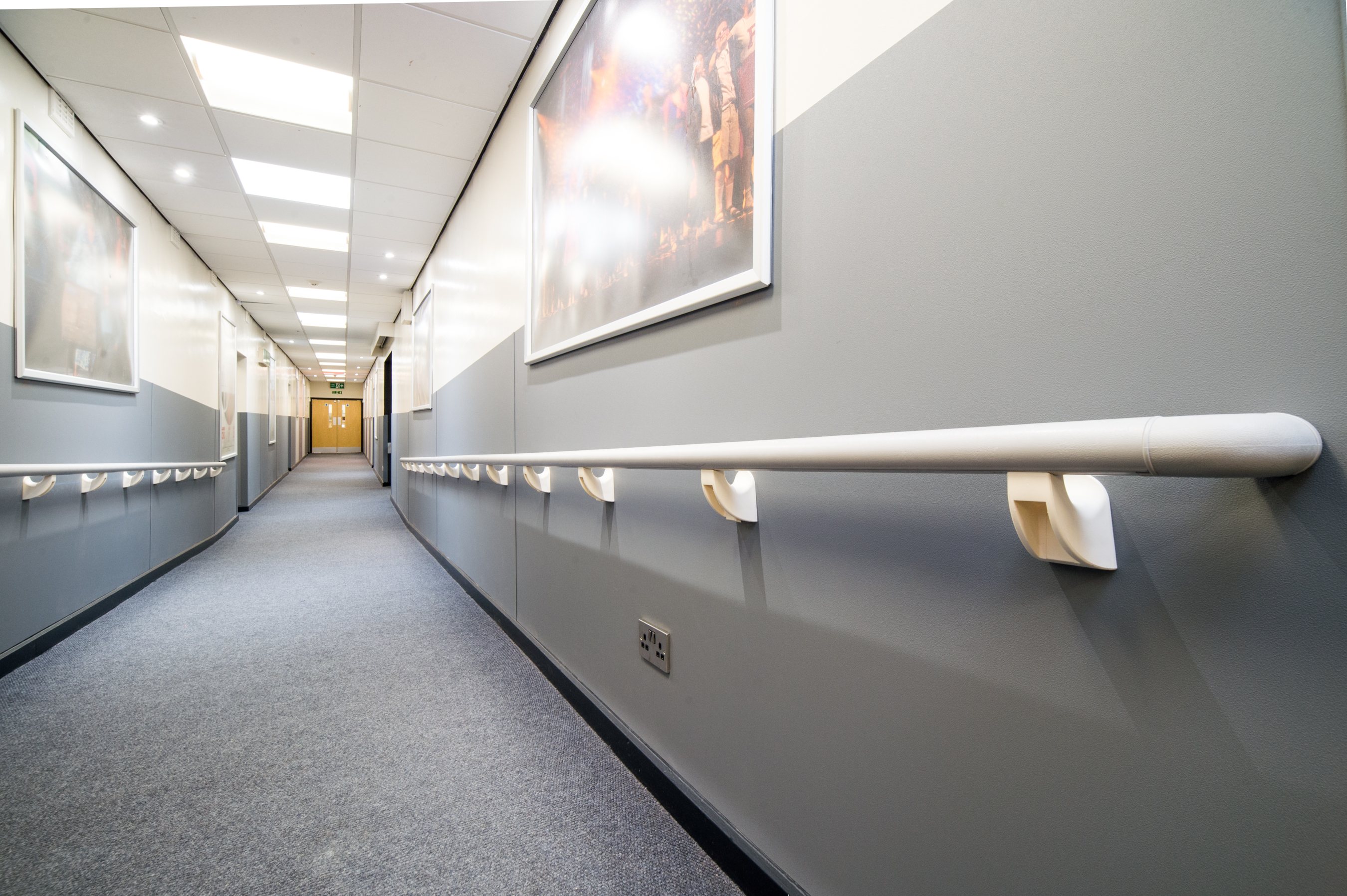 Corners vulnerable to damage by people passing through and the movement of equipment, were also protected with Yeoman Shield 75 x 75mm corner protection angles in contrasting Graphite Grey colour. On the ramp areas of the hallways there is the addition of Yeoman Shield’s 50mm dia. PVCu handrail in Mid Grey mounted on cream PVCu under slung brackets.