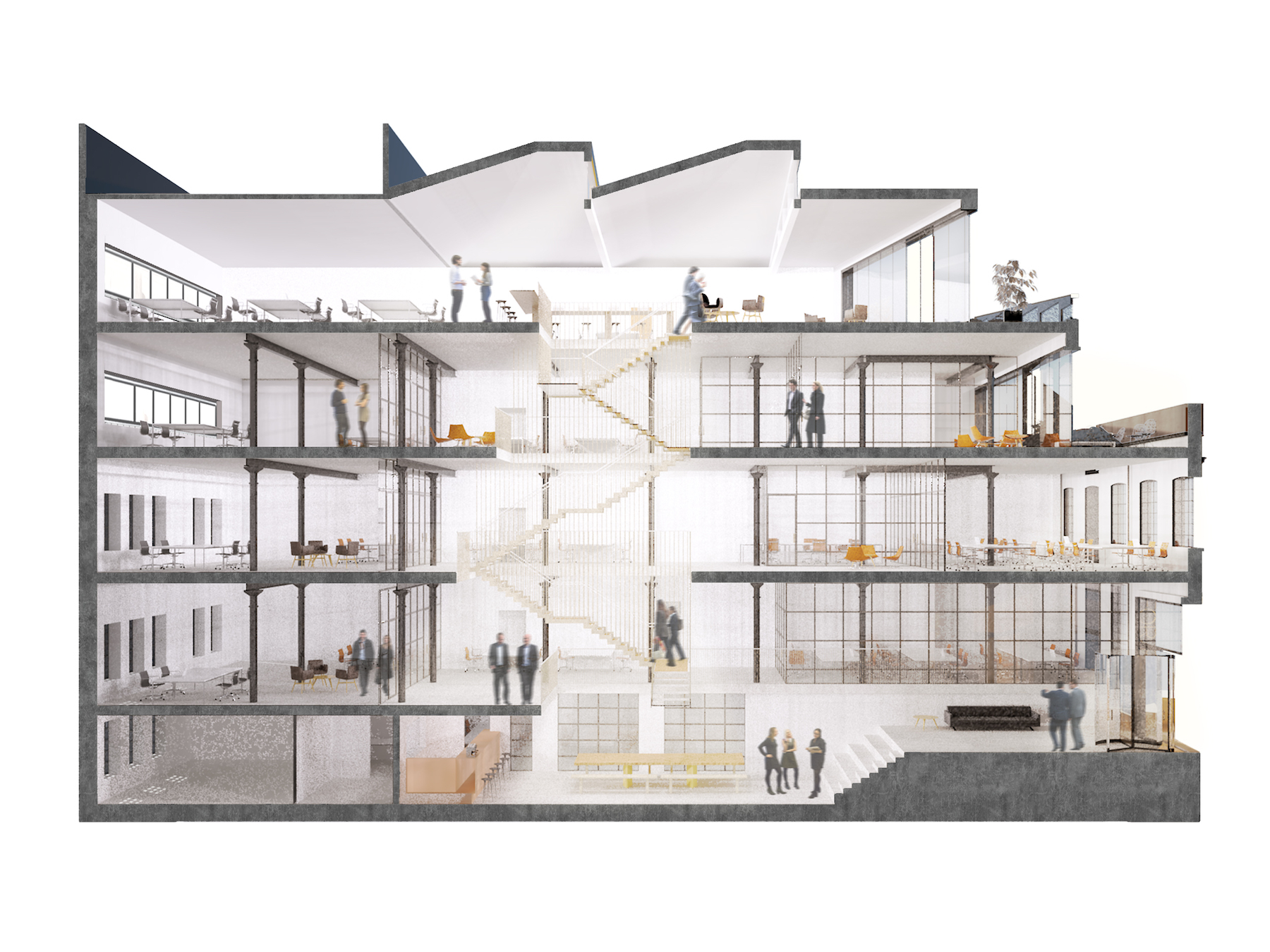 The 32,200 sq ft office building is located on Princelet Street and was originally constructed in the 1800s. It is being extensively refurbished and extended, including the addition of two floors, a new roof structure, and a larger atrium featuring a new cantilevered staircase.