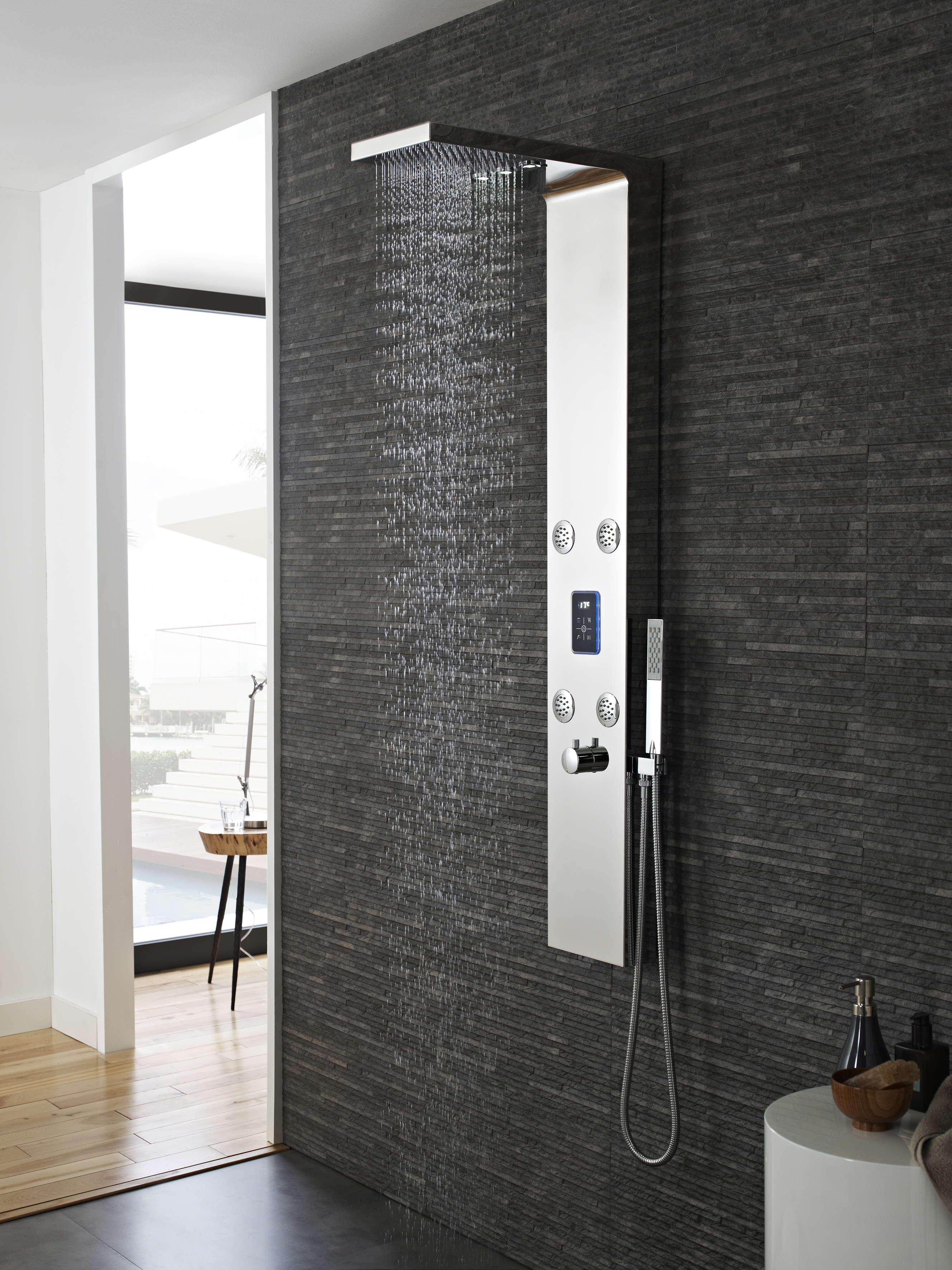 The overhead shower enables you to choose regular shower flow to revive and refresh, or a more concentrated waterfall option, providing a soothing cascade of water, plus 3 LED lights – ideal for darker mornings or added illumination when you’re washing your cares away at the end of the day. For days when you want a refreshing shower without getting your hair wet, the panel also features 4 body jets, plus a handshower.