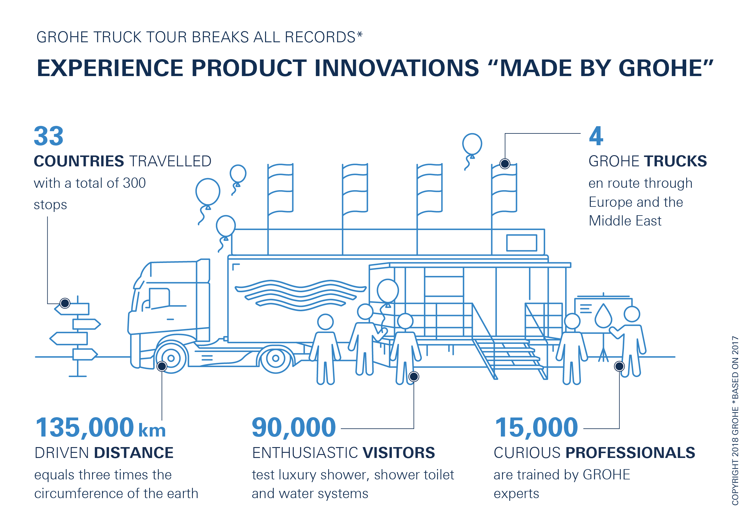 Since March 2017, GROHE has been on the road in Europe and the Middle East with a total of four mobile showrooms. So far, the trucks have covered approximately 150,000 kilometres in 33 countries. The current route equates to more than three circumnavigations of the world. Inside the trucks, private and professional visitors can gain insights into GROHE’s latest innovations, test the products and take part in open trainings. For 2018, more than 800 events are planned.