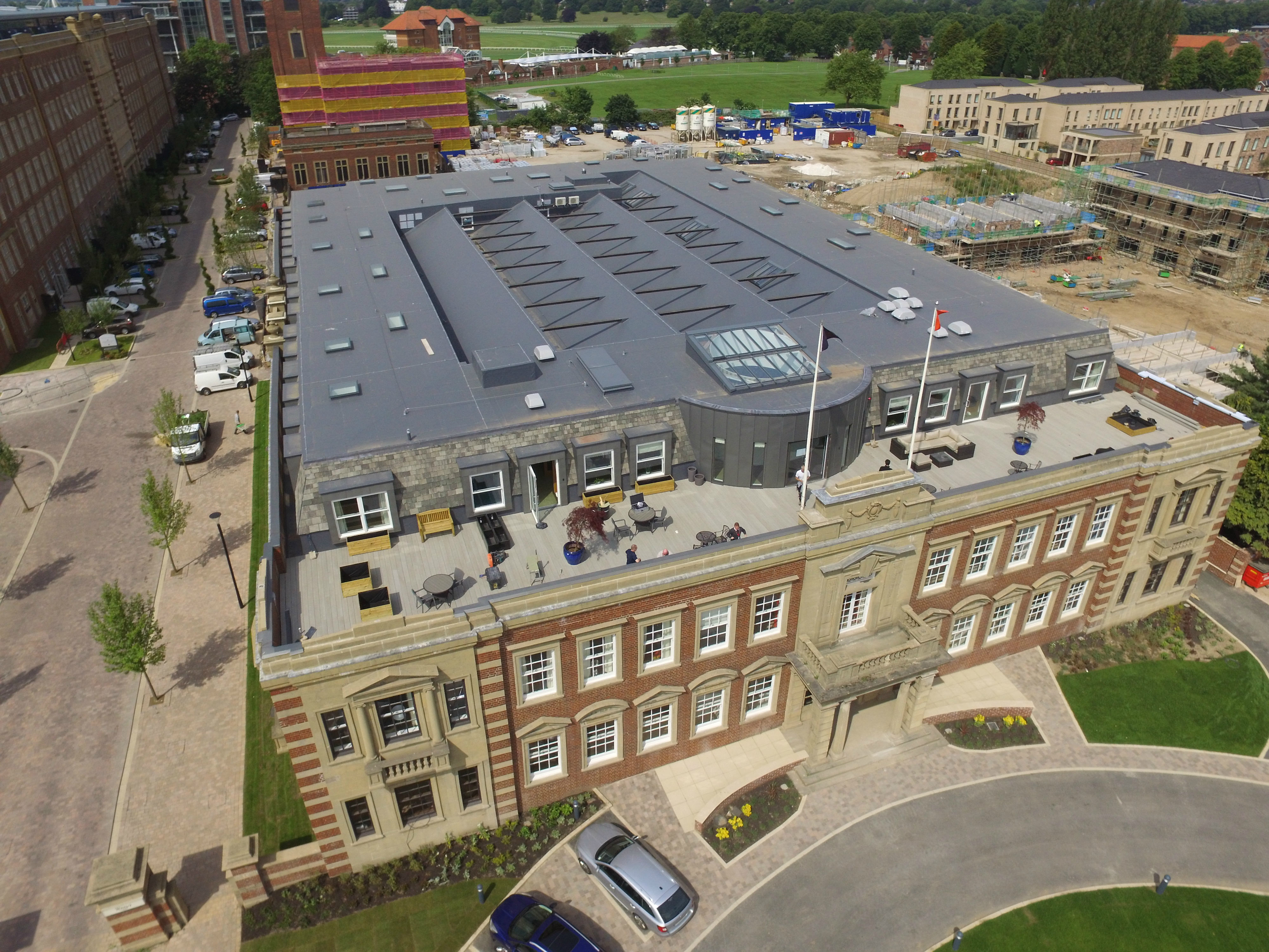 In addition to the existing roof areas, an extra floor to the building was constructed around the north lights. Its steep slated mansard-type external elevation included approximately 60 dormer windows, which required zinc on all the vertical faces and Sarnafil on the tops. The flat roof area of the extension was then also covered in the Sarnafil system, along with 140m of parapet guttering detailing, and a new roof terrace area.