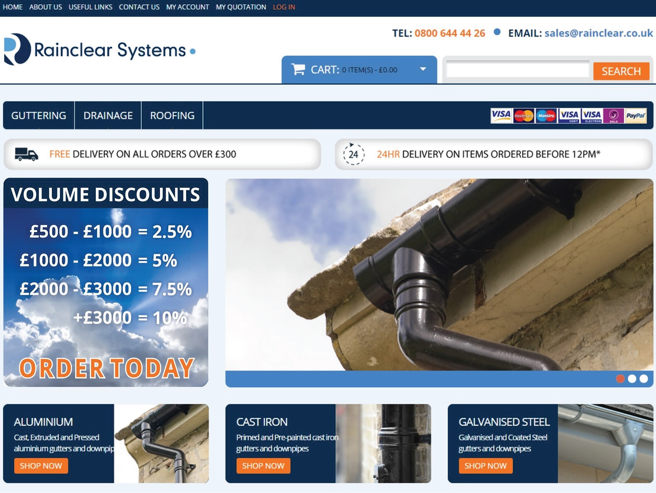 Online retailer Rainclear Systems, the UK’s largest stockist of metal guttering systems and rainwater goods, has just launched a fresh new website. The site at www.rainclear.co.uk makes navigating through the company’s huge range of guttering and drainage products and all the options on finishes, size and colour even more straightforward for their customers.