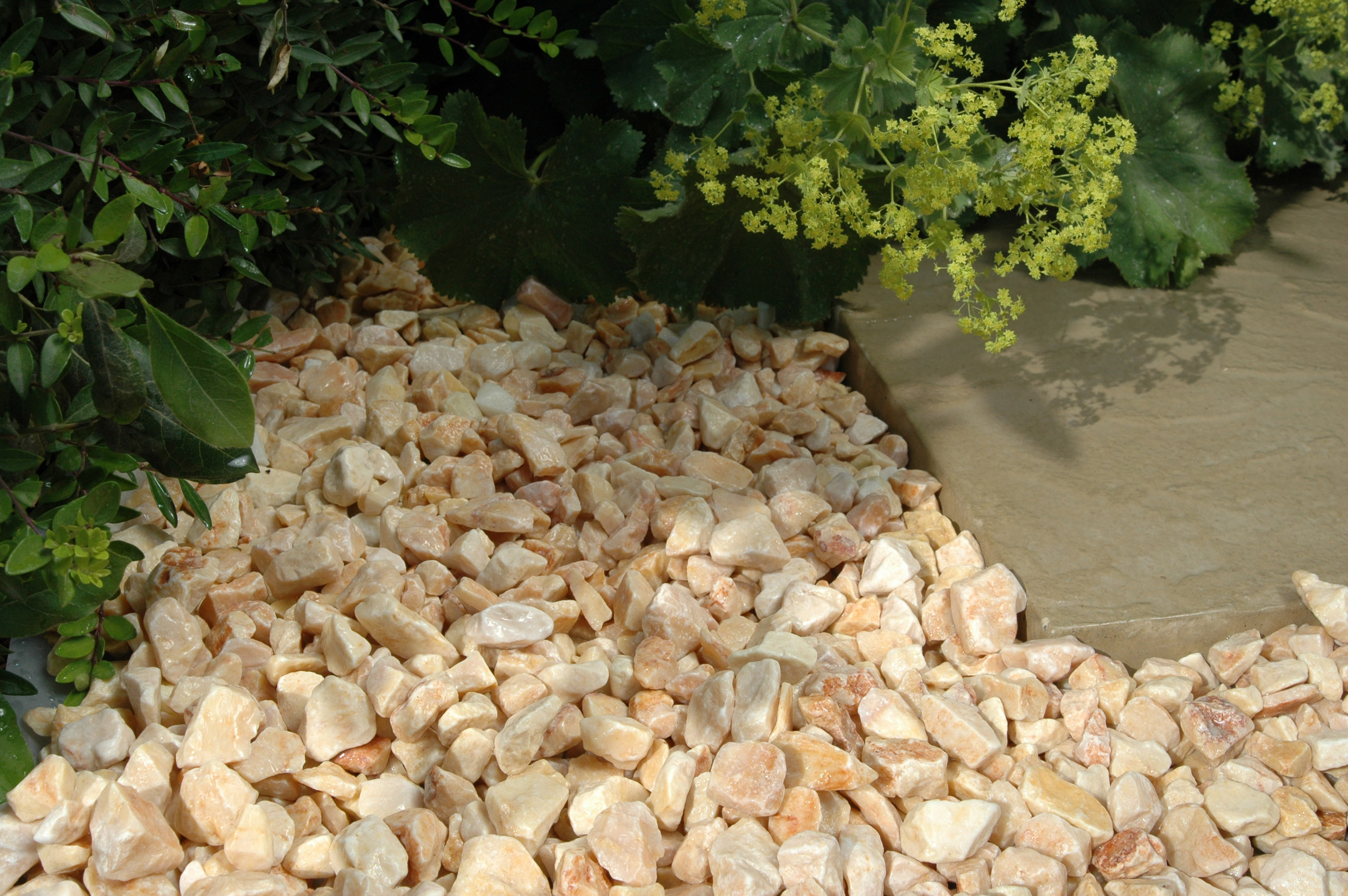 Following on from this success we now introduce our 20mm ONYX a further unique, highly decorative chipping. The enriching, golden, buff and apricot tones of this 20mm angular chipping uplift and contrast beautifully with paving. Onyx is available to order in either bulk bags or pre-pack bags with complimentary samples available by immediate delivery.