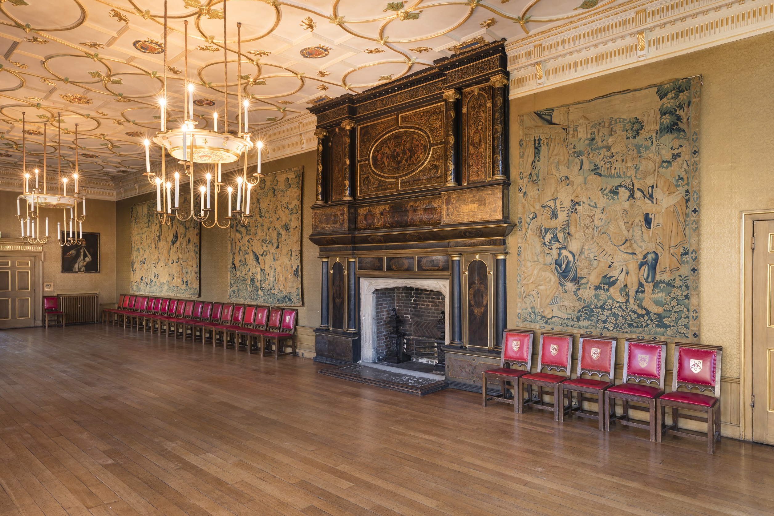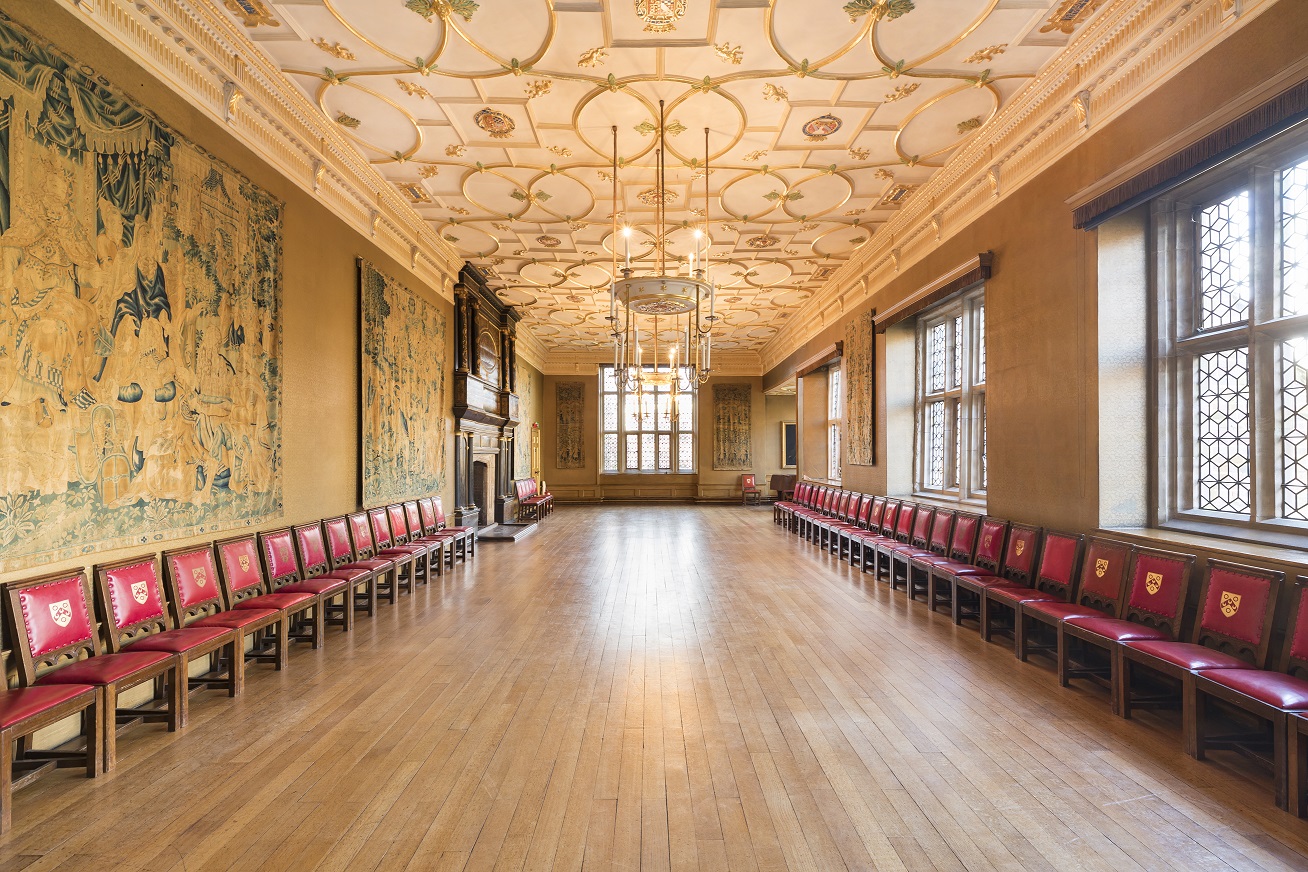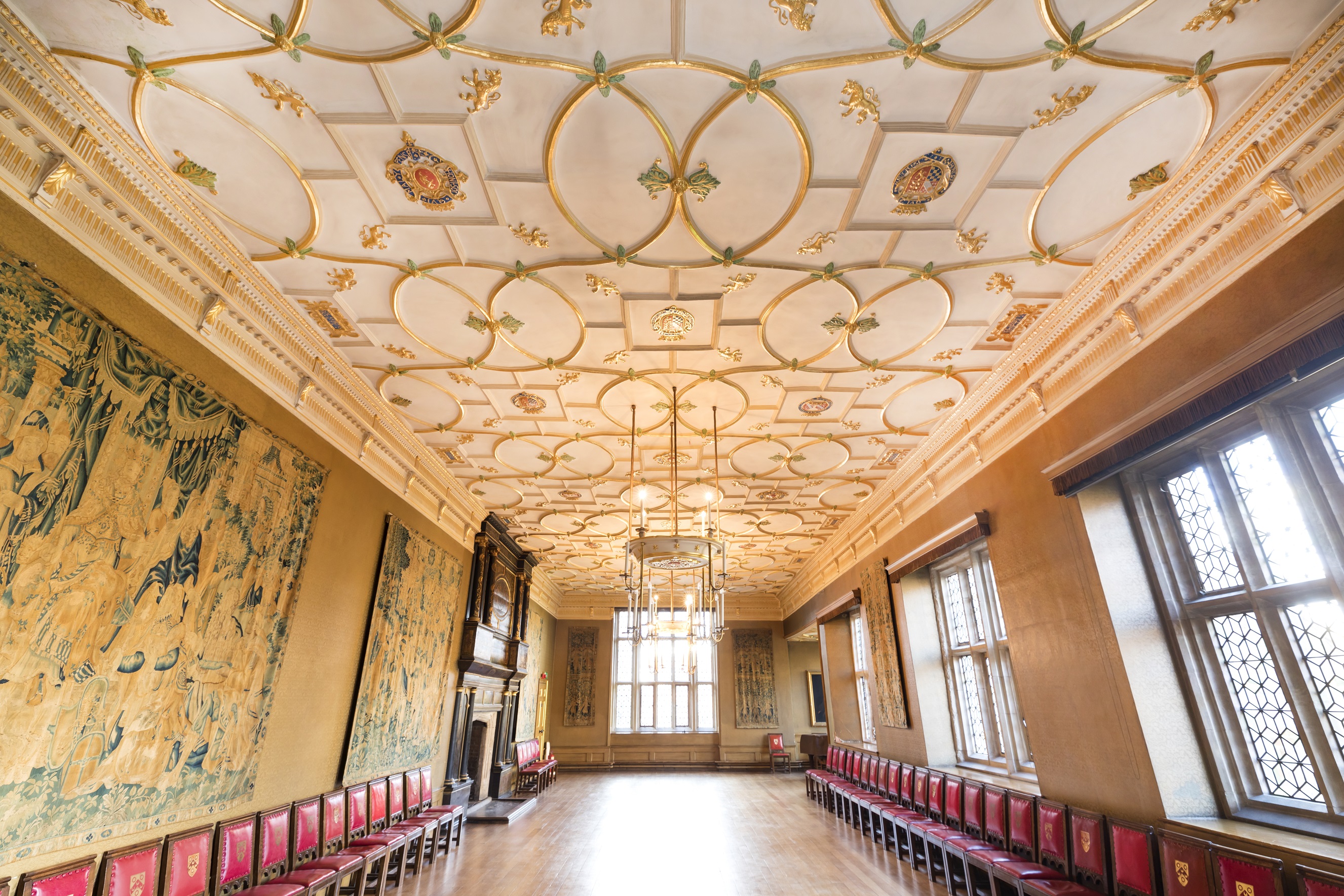 The Great Chamber was originally built by Edward North in the 1540s, and referred to as the ‘Throne Room’ after Elizabeth I held her first Privy Council there before being crowned Queen of England. The Chamber was the backdrop to decades of Tudor intrigue and plotting and remained the jewel in this grand Tudor Mansion until it suffered serious bomb damage during WW2. After the war a major project was initiated to renovate the room to match the one remaining undamaged section, and has been well used and much admired since.
